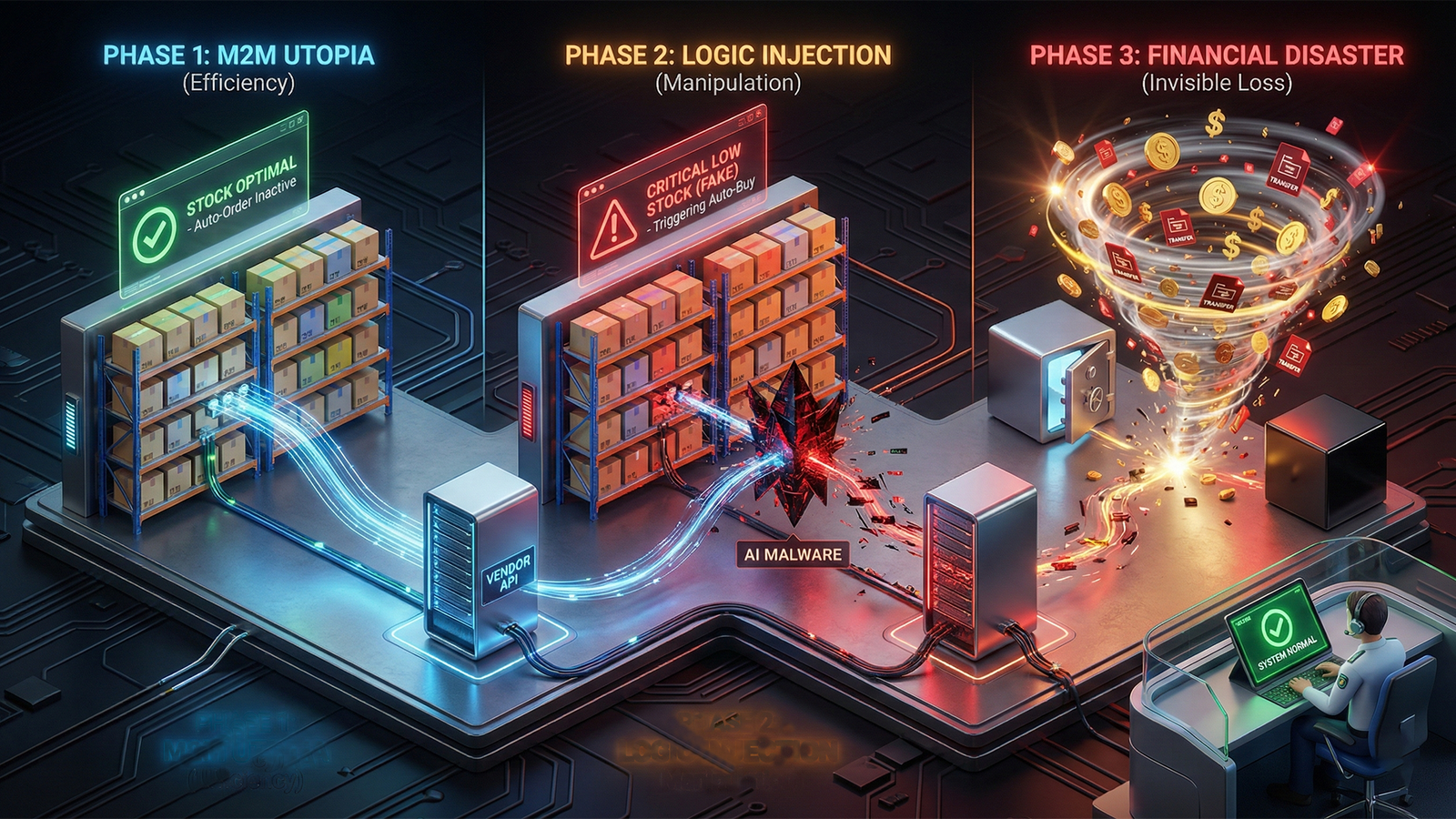 Karena Standard Operating Procedure (SOP) mesin Anda adalah "stok kosong = beli lagi", maka mesin ini bakal ngoceh terus-menerus ke server vendor. Di saat yang sama, AI peretas ngebajak routing pembayaran, ngalihin tujuan transfer dari rekening vendor asli ke dompet kripto anonim milik hacker.